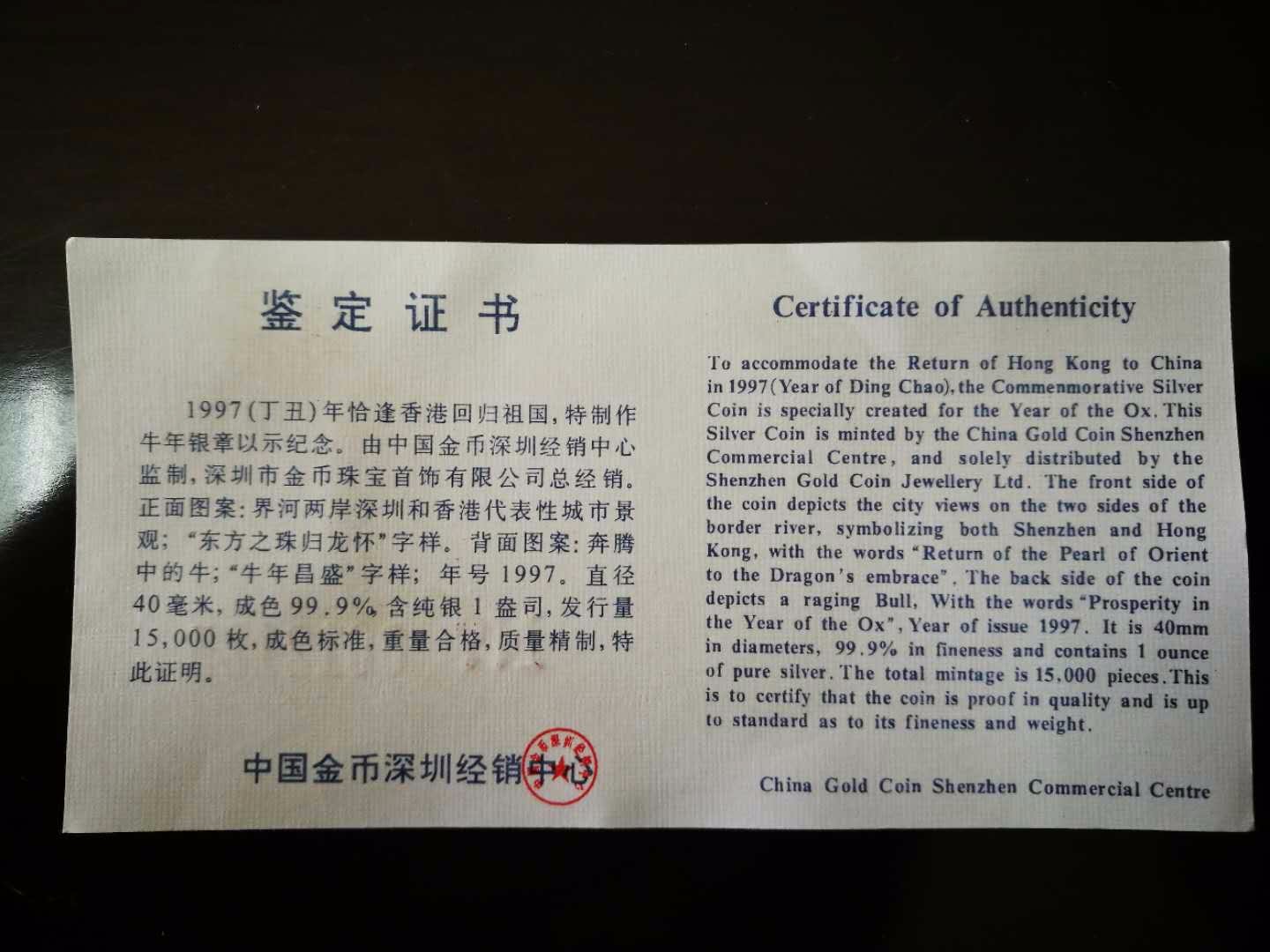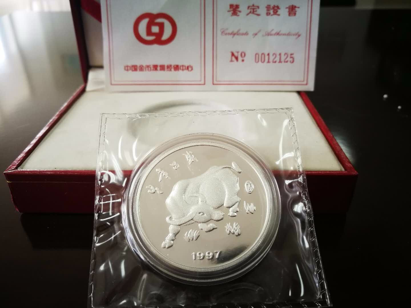 1997(丁丑)年恰逢香港回歸祖國,特制作牛年銀章以示紀念。由中國金幣深圳經銷中心監制,深圳市金幣珠寶首飾有限公司總經銷。正面圖案:界河兩岸深圳和香港代表性城市景觀;“東方之珠歸龍懷”字樣。背面圖案:奔騰中的牛;“牛年昌盛”字樣;年號1997.直徑40毫米,成色99.9%,含純銀1盎司,發行量15000枚,成色標準,重量合格,質量精致,是收藏界不可多得的藏品。