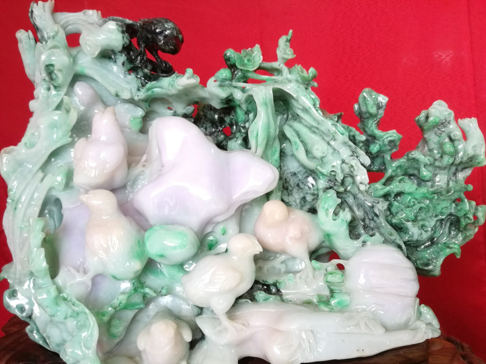 擺件以和田玉雕成,正面雕刻五只嬉戲的鵪鶉,上面雕刻一只花喜鵲,選材純凈油潤(rùn),雕琢寫(xiě)實(shí)逼真,神形具現(xiàn)。在我國(guó)吉祥紋飾中,常以鵪鶉之“鵪”諧“安”之音,喜鵲能報(bào)春報(bào)喜,有喜慶之兆,取家庭幸福,生活美滿,喜氣連連、圓圓滿滿之意。此擺件鵪鶉和喜鵲形象生動(dòng)活潑,雕琢精致,寓意美好,表達(dá)了人們對(duì)美好生活的向往和追求。