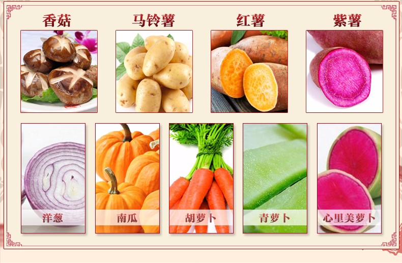 配料表:紅薯、胡蘿卜、洋蔥、香菇、馬鈴薯、南瓜、紫薯、麥芽糖等