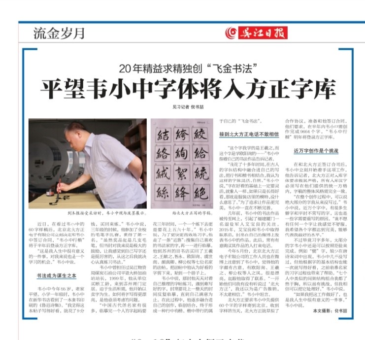 韋小中臨帖三十年,集王羲之、王獻之、智永、歐陽詢、虞世南、顏真卿、柳公權等歷代名家數千字潛心反復研習臨摹,練就“集古體”,人稱“韋楷”。上世紀90年代起在蘇州賣字,至今二十余年,創作銷售書法萬余幅;2002年被江蘇省國畫院聘為參展書法家;2005年參加香港富得藝術品拍賣會,一幅《朱子家訓》僅3平尺成交價為3800港幣;2008年起先后為杭州六和塔書寫大作《六和塔記》,蘇州玉皇宮書寫碑文《玉皇宮碑記》,香港黃大仙廟書寫觀音殿、關帝廟抱聯;2010年為蘇州穹隆山上真觀恢復乾隆皇帝對聯和碑刻,同年5月在總結泥金工藝和貼金工藝的基礎上,獨創“飛金書法”藝術品,為海內外藏家爭相訂購。