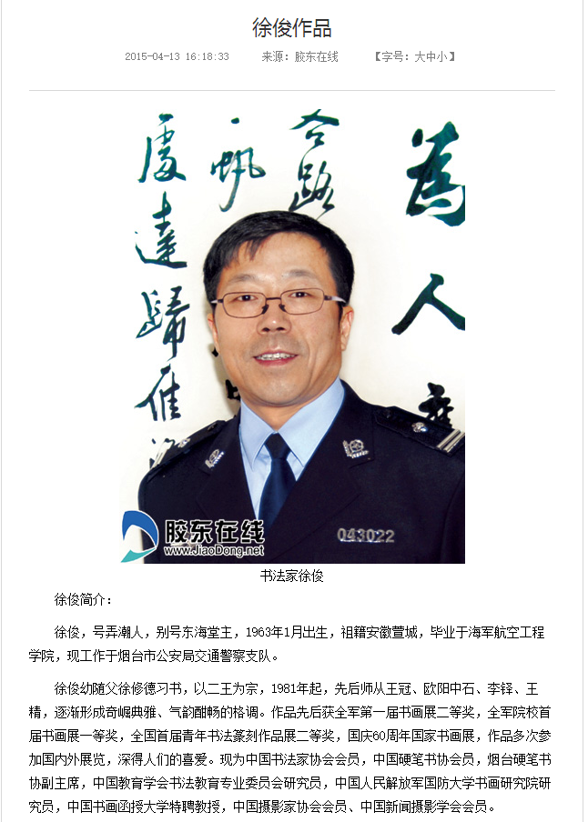 徐俊,號弄潮人,別號東海堂主,1963年1月出生,祖籍安徽萱城,畢業于海軍航空工程學院,現工作于煙臺市公安局交通警察支隊。