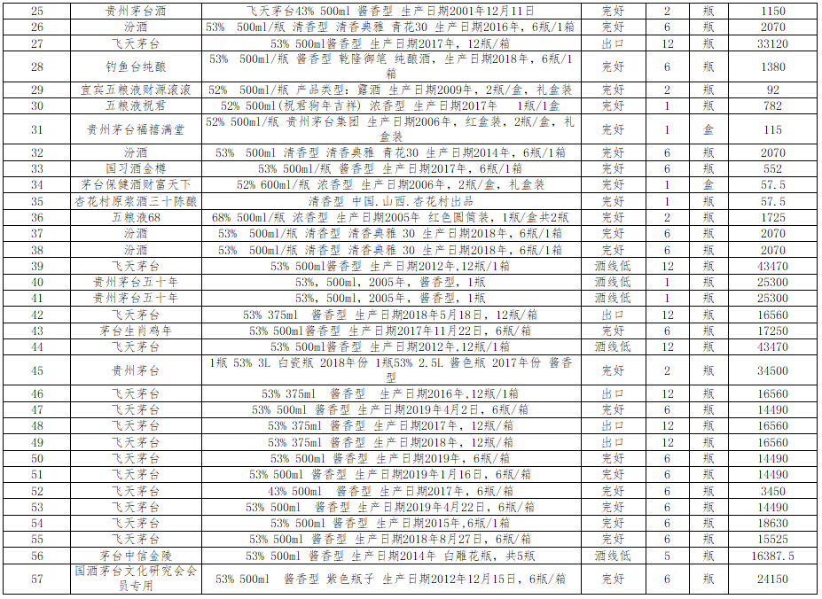 標的三:庫存酒類整體打包起拍價2613985元,保證金500000元,詳情見以下清單(僅供參考)