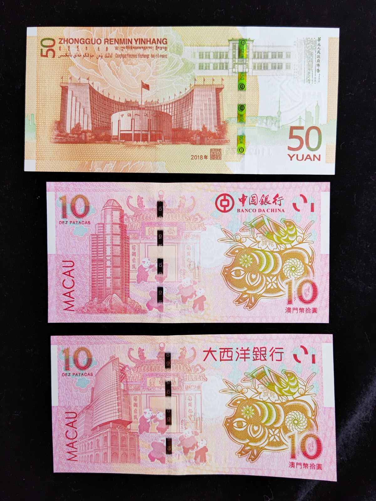 線上支付發行七十周年紀念鈔50元+澳門十元+俄羅斯冬奧會紀念鈔一張共四張