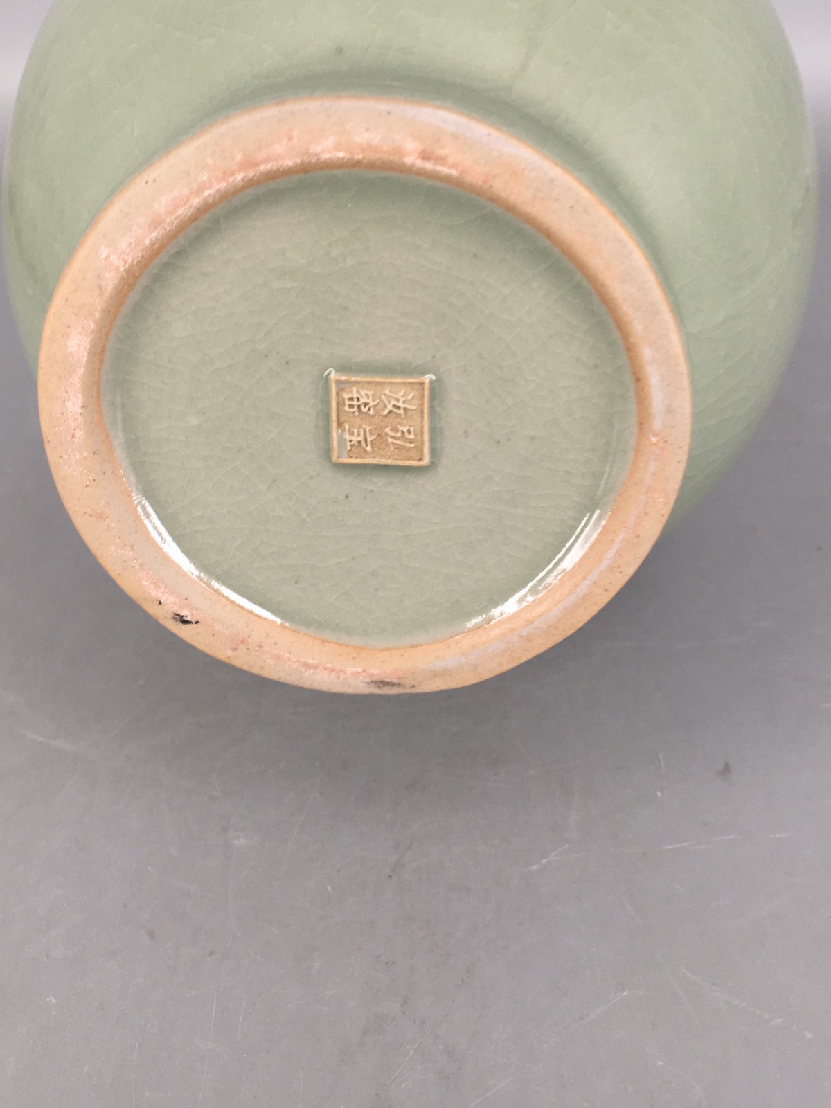 當代汝瓷豆綠釉玉壺春瓶,高35厘米,口徑7厘米。底款:弘寶汝窯。