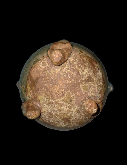 【描述】此爐通體施天藍釉,直口平折沿搭配扁鼓腹造型,附雙耳及三矮曲形蹄足,釉層肥厚且底足存在積釉現象,足部曲線與腹部弧線形成韻律呼應。