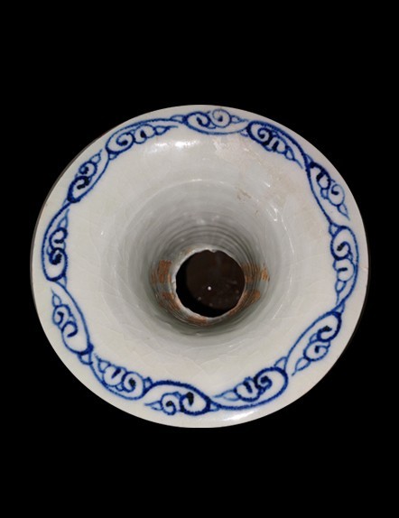 【描述】該瓶口呈喇叭狀,細頸,垂腹,圈足,造型別致。其外壁通體以青花釉里紅為紋飾,內口邊則細膩地描繪著青花卷草紋。整器圖案層次分明,從頸部的蕉葉紋到肩部的寶相花蓮瓣紋,再到腹部的雙邊棱形開光和蓮瓣紋,無不體現出匠人的匠心獨運。特別值得一提的是,開光內堆塑的纏枝花葉和兩種花紋,以青花飾葉、釉里紅飾花朵,使得整器在色彩上既豐富又和諧。